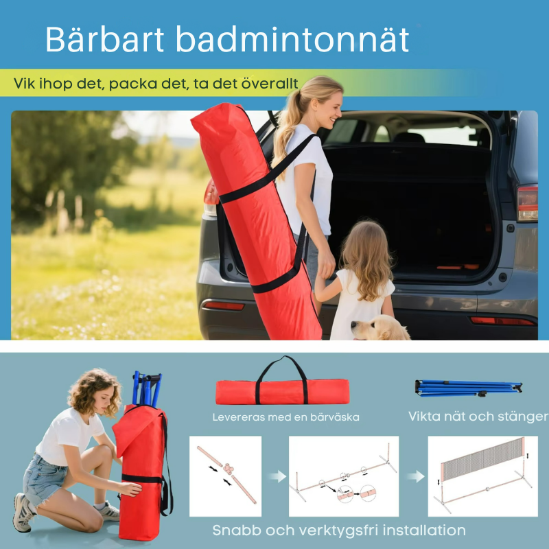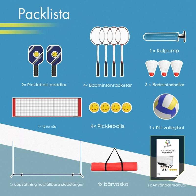 - Paketinnehåll: 1 × 10ft Nät, 1 × Set med Vikbara Stöd, 4 × Badmintonracketar, 3 × Badmintonbollar, 2 × Pickleballracketar, 4 × Pickleballs, 1 × PU Volleyboll, 1 × Bollpump, 1 × Bärväska, 1 x Användarmanual