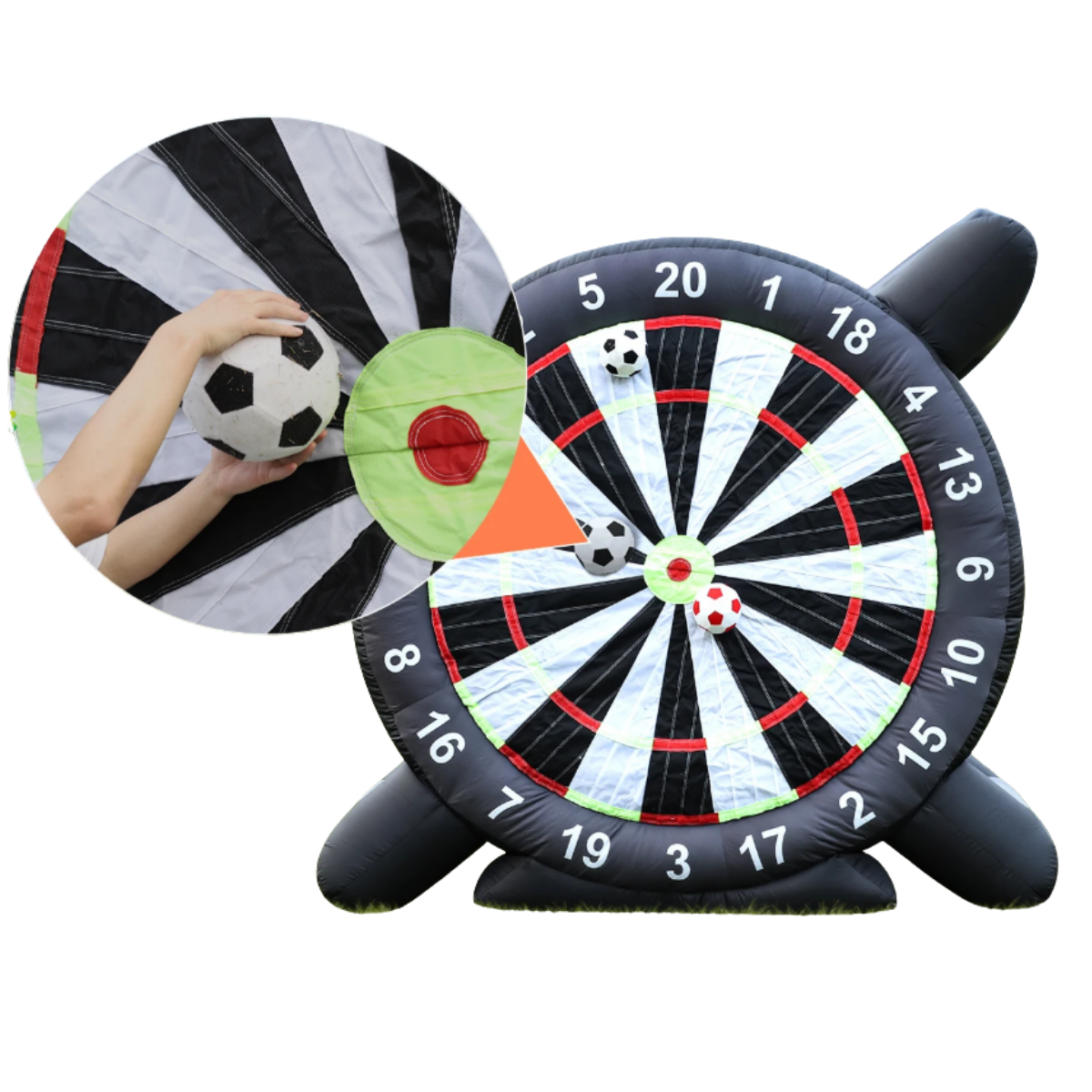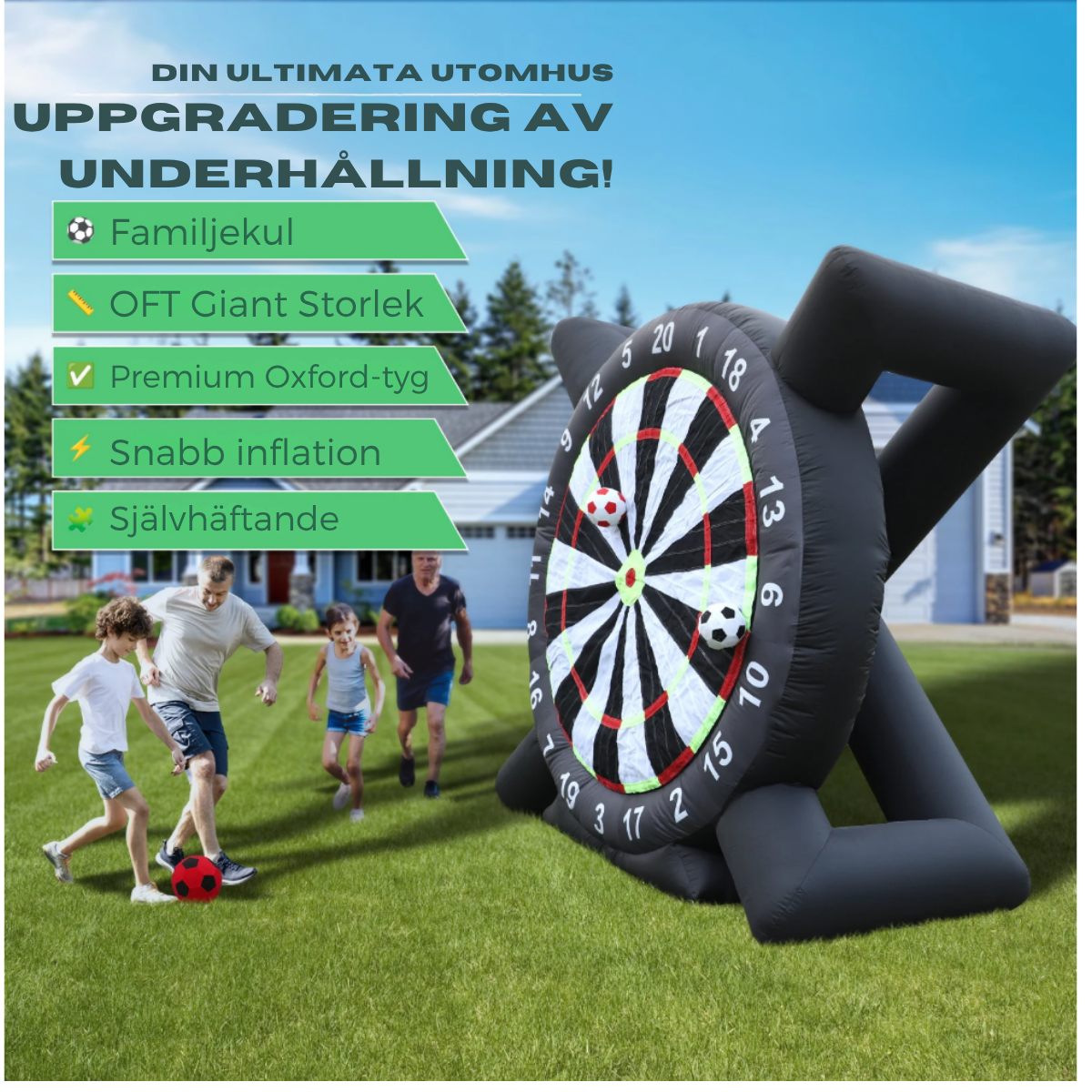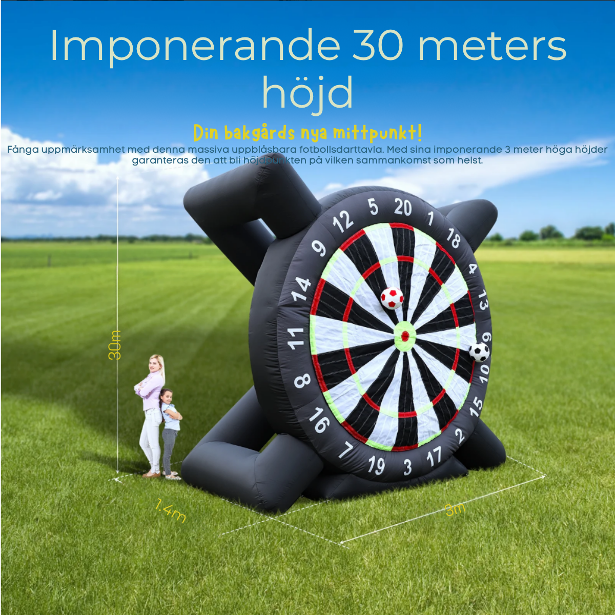 Jättestor Uppblåsbar Fotbollsdart 3m är den perfekta underhållningen för både barn och vuxna på kalas, event eller i trädgården. Tavlan fungerar som en kombination av dart och fotboll där du sparkar fast bollarna på den självhäftande ytan. Tack vare sin storlek på hela 3 meter blir den ett riktigt blickfång som garanterar massor av skratt och tävlingar.