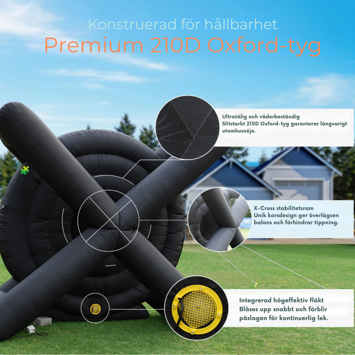 Tillverkad i slitstarkt 210D Oxford-tyg som är både väderbeständigt och hållbart, designad för att tåla långvarig användning utomhus. Den är enkel att blåsa upp med den medföljande 370W-blåsaren, och extra tillbehör som bollar, rep, markspik och sandpåsar ingår för maximal stabilitet.