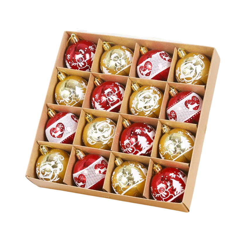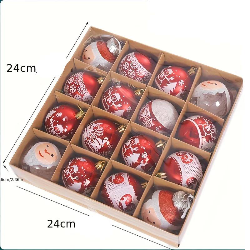 Detta vackra set innehåller 16 dekorativa julkulor i glansig och matt finish, prydda med snöflingor, hjärtan och tomtemotiv. Den röda och vita färgkombinationen ger julgranen ett elegant och varmt uttryck som passar alla inredningsstilar.
