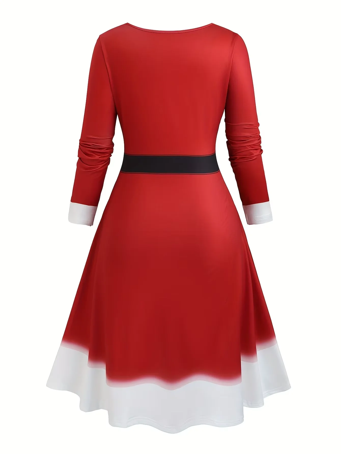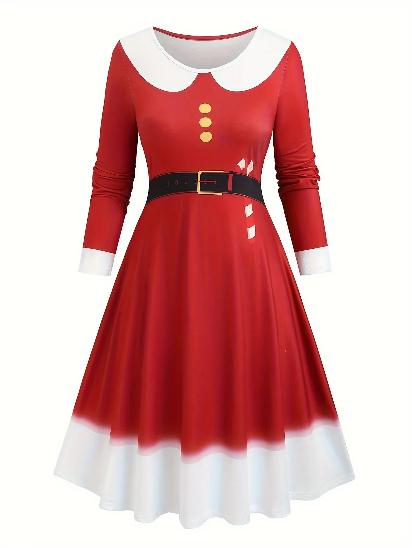 Tillverkad i mjukt och stretchigt polyester-tyg med stickad vävteknik, erbjuder klänningen både komfort och rörelsefrihet. Den har långa ärmar, vit krage och manschetter, samt ett tryckt svart bälte med gulddetalj som markerar midjan och ger en klassisk tomtemor-look.