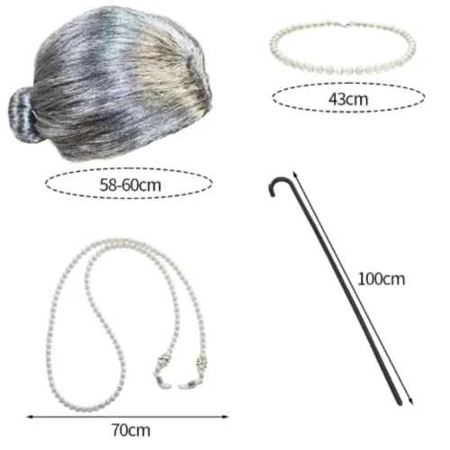 Förvandla vilket barn som helst till en charmig mormor med detta kompletta tillbehörspaket. Perfekt för rollspel, temafester eller maskerader där en äldre look önskas.